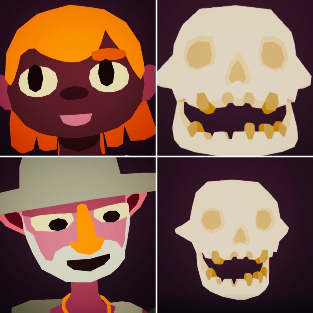 I’ve already written at length about how much I loved I Am Dead (Hollow Ponds, 2020) as an archaeologist and as a museum worker. However, I want to discuss another element of the game a bit further – more specifically, the final level, in which the player moves between the present and the past, using the remains of Prehistoric peoples to access their memories and experiencing the far past through them. Of course, in-game this time-traveling adventure is not too much of a leap in fantastical logic – you are playing as the ghost of a deceased museum curator who can read thoughts and view personal memories, after all! But this final level is certainly a new extension of this logic, as previously you’ve only been able to interact with the thoughts and memories of living peoples. Like the rest of the game, the purpose of uncovering these memories is to identify important moments relating to a particular person’s life – however, in this case you’re actually searching through the collections of a museum and finding artefacts that correlate with these memories, leading to some interesting tensions between the interpretations of artefacts versus their realities (including one particularly important artefact that gets tossed into a box of miscellaneous rocks).